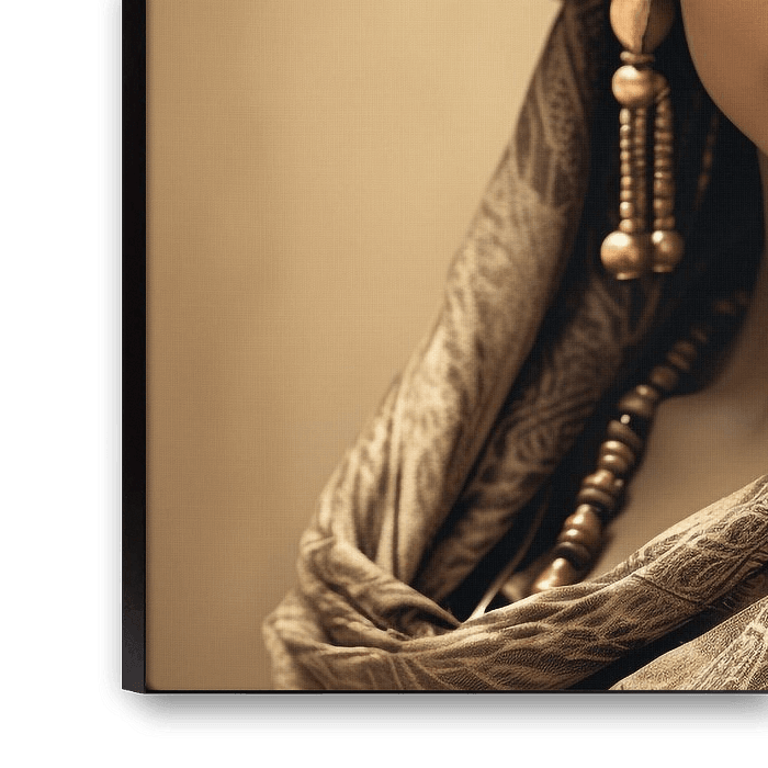 Portrait of a beautiful African woman with headscarf that continues in a scarf. Colour scheme black gold sepia. Beautiful earrings complement the overall look. Fitting with various styles and trends.