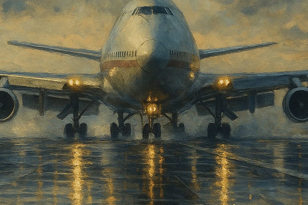 An impressive painting of a Boeing 747 landing on a shimmering runway just after a rainstorm. The reflections of the landing lights dance on the wet tarmac, while the looming cloudy sky slowly opens to the evening sun. This work captures the mighty moment when man and machine defy the elements - a tribute to the majestic jumbo jet and the poetry of aviation.