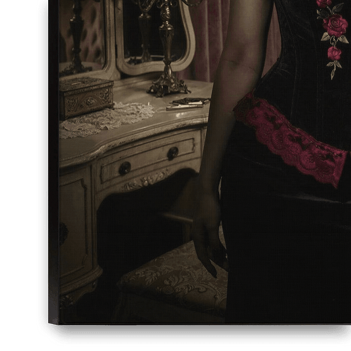 The woman stands slightly inclined, almost absent. Her gaze lowers, not out of shame, but out of exhaustion. The moment does not belong to seduction, but to…