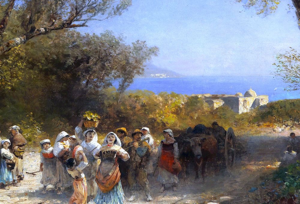 A group of men and women are coming from the land where they worked, farmers who worked on the harvest or other work of agriculture. Carrying musical instruments and a wagon with two pack animals, cattle, probably both an ox, the workers walk happily along a path home.