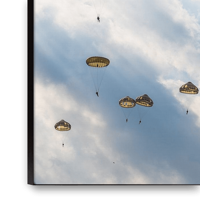 This photo captures a special moment when paratroopers gently float down against a backdrop of a typical Dutch cloudy sky. These paratroopers, with their sunny hues, float above the Ginkelse Heide in Ede, and are part of an annual commemoration that honours the brave jumps of soldiers during Operation Market Garden in World War II. It…