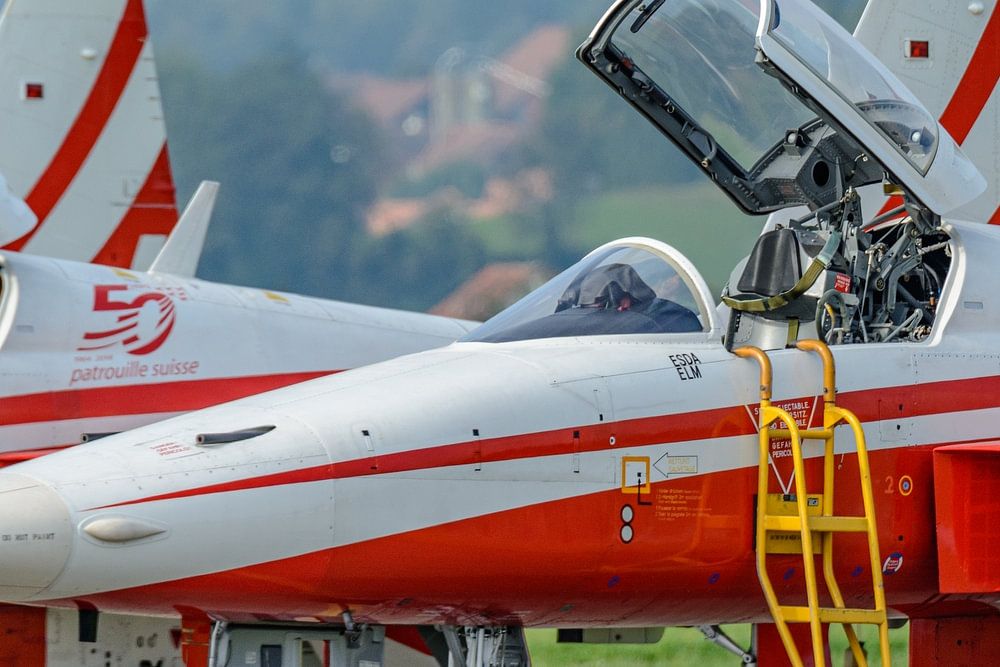 The Northrop F-5 Tiger II aircraft of the Patrouille de Suisse are ready for the next flight demonstration.