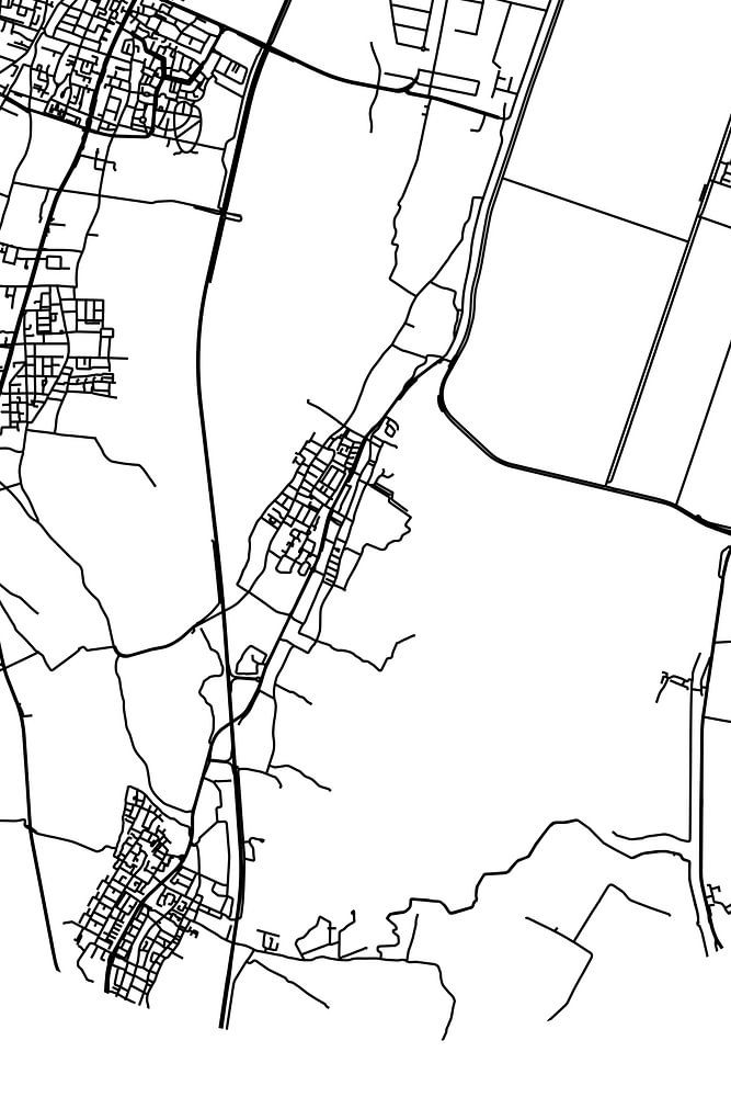 Black and white map, street map or street plan of Akersloot. Akersloot is located in the municipality of Castricum, province of North Holland. On the city map all public roads in Akersloot are included. Furthermore, the map features the coordinates of the center of Akersloot.