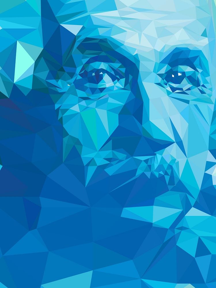 This captivating low poly artwork presents a modern and geometric interpretation of Albert Einstein, composed exclusively of interlocking triangles. Utilizing a vibrant yellow and blue color palette, each triangular facet is carefully arranged to capture the depth and character of Einstein’s iconic visage. The contrasting hues of yellow and blue not only create a visually striking effect but also symbolize the brilliance and depth of Einstein's contributions to science and humanity. The meticulous arrangement of geometric shapes forms a cohesive and recognizable portrait, demonstrating a seamless blend of artistic creativity and mathematical precision. This piece celebrates the fusion of Einstein's innovative spirit with contemporary digital artistry, highlighting the elegance of simplicity and the impactful use of color in the low poly technique.
