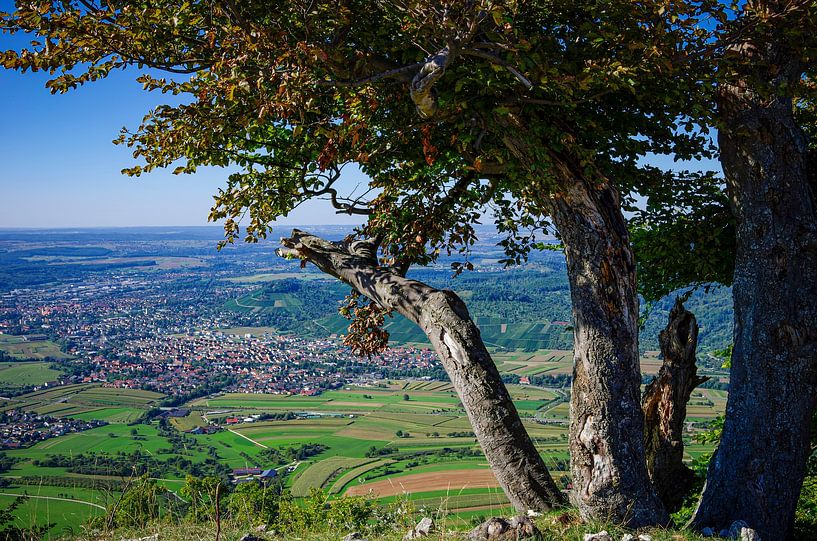 Picturesque scenery at the edge of the Swabian Alb near Olgafels on Rossfeld in Metzingen-Glems, Baden-Württemberg, Germany.