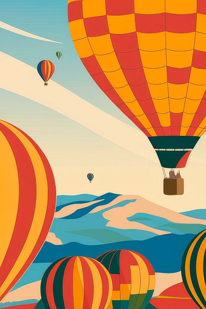 Colourful hot air balloons float majestically over hilly landscapes as they pierce the expanse of the sky. The warm tones and stylised design add a playful touch to any room. Ideal for the living room to create a positive atmosphere and awaken dreams of adventure and freedom.