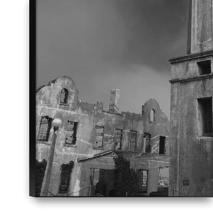 Sometimes still shrouded in fog, the lighthouse on Alcatraz showed itself every now and then. The half collapsed director's house in the background makes it even more 'spooky'. A brilliant contrast in black and white.
