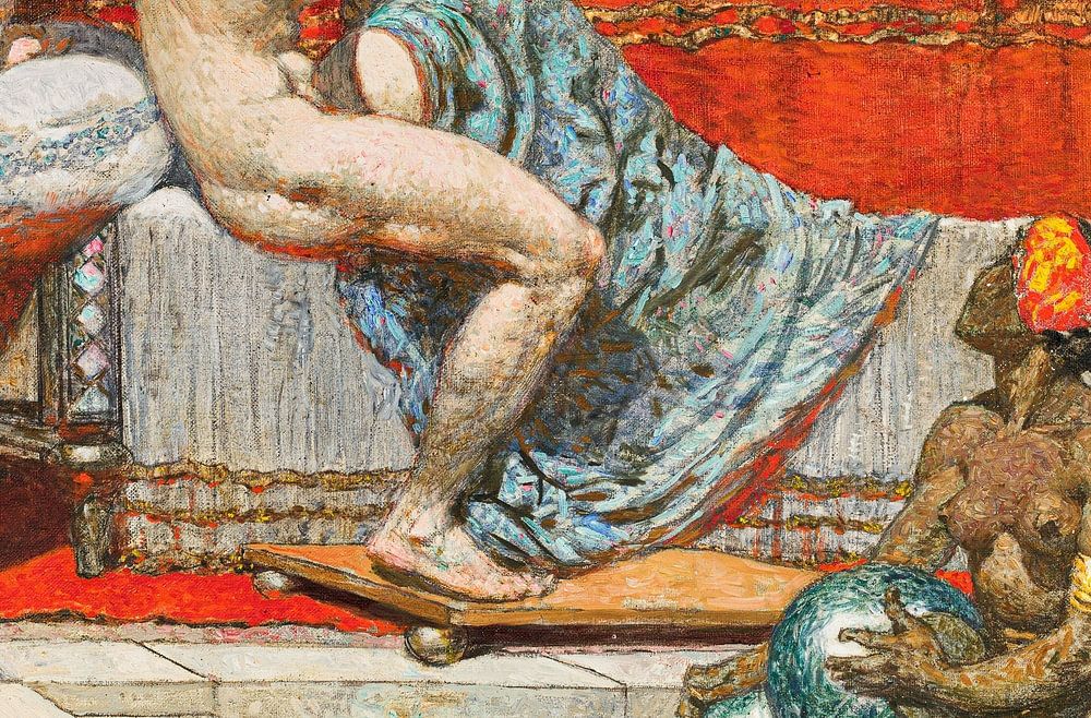Two figures are sitting at a bath house. The white woman is sitting naked on a bed while the black lady is on her knees wearing a skirt and topless.