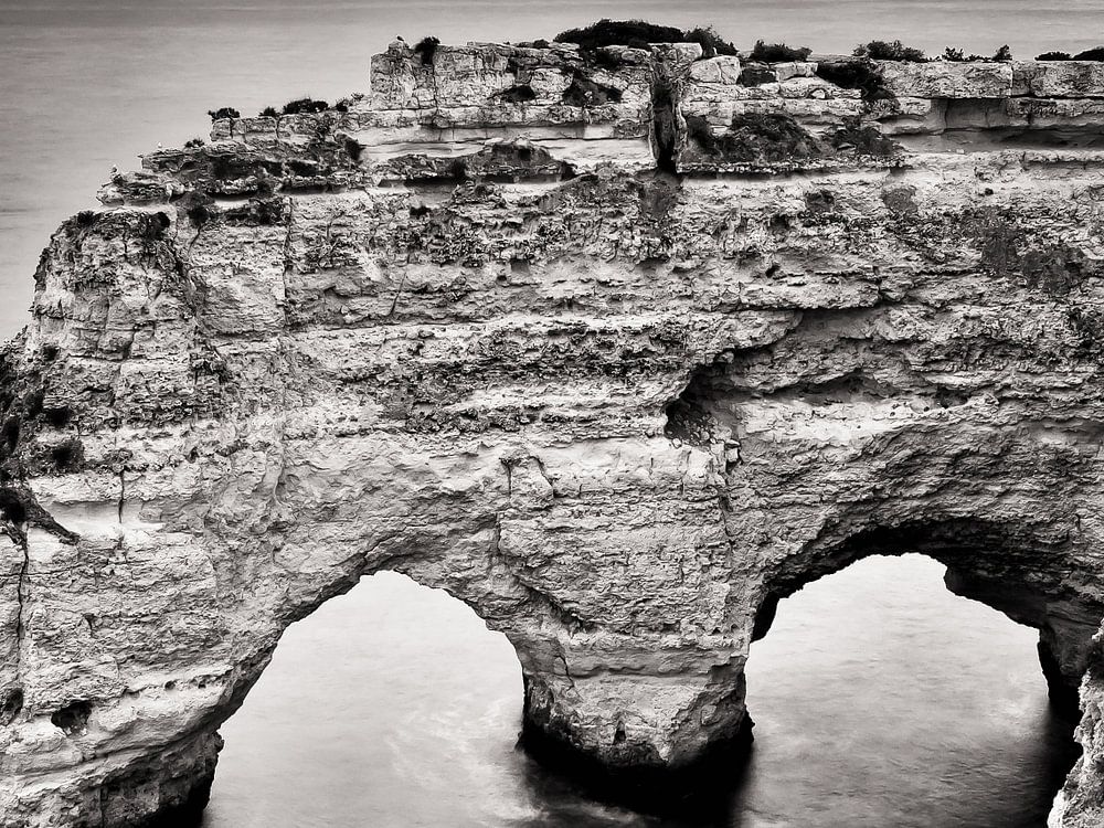 A black and white impression of the Algarve coast in Portugal.