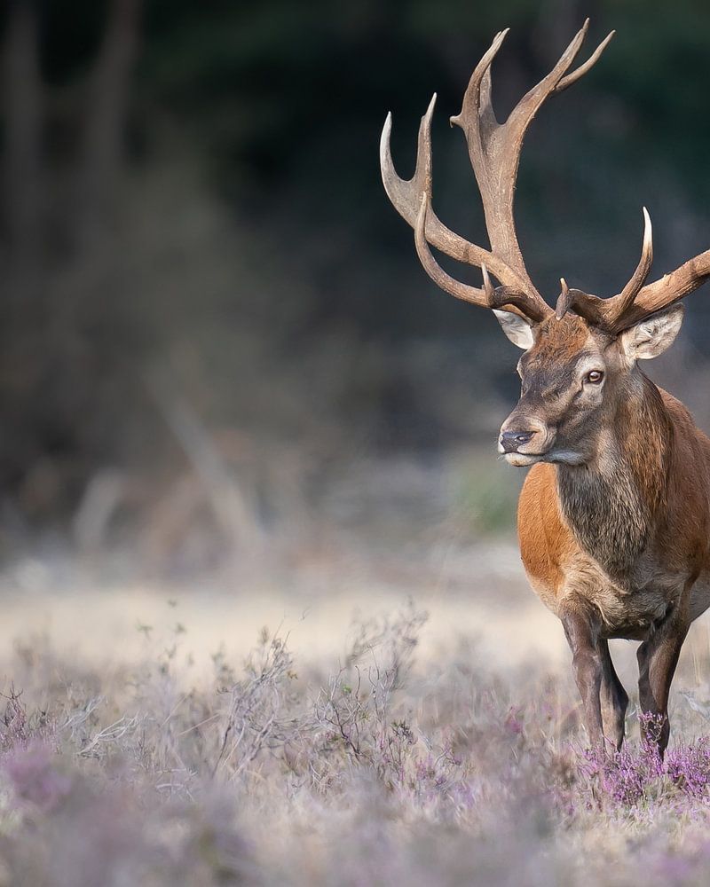 A majestic red deer stands regally on an expansive purple heath. The warm sunlight accentuates its powerful antlers and glossy coat. Surrounded by the vibrant colors of blooming heather plants, the photo exudes a sense of peace and harmony within the serene, enchanting natural landscape.