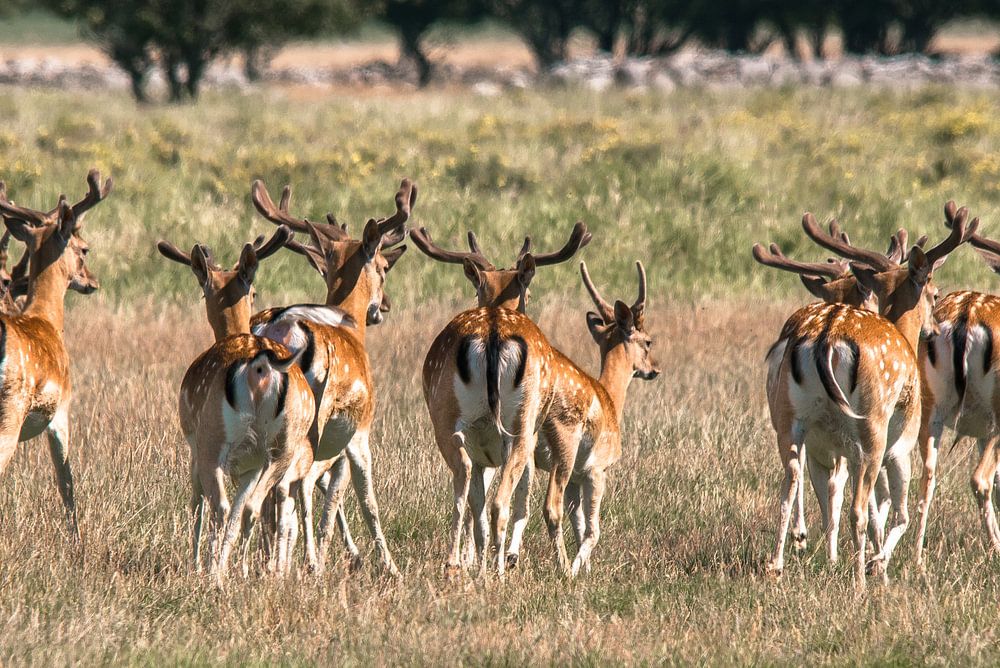 A group of deer running on the island of Öland (nature reserve Ottenby) in Sweden.