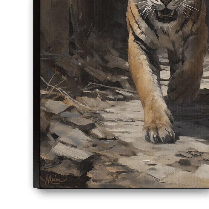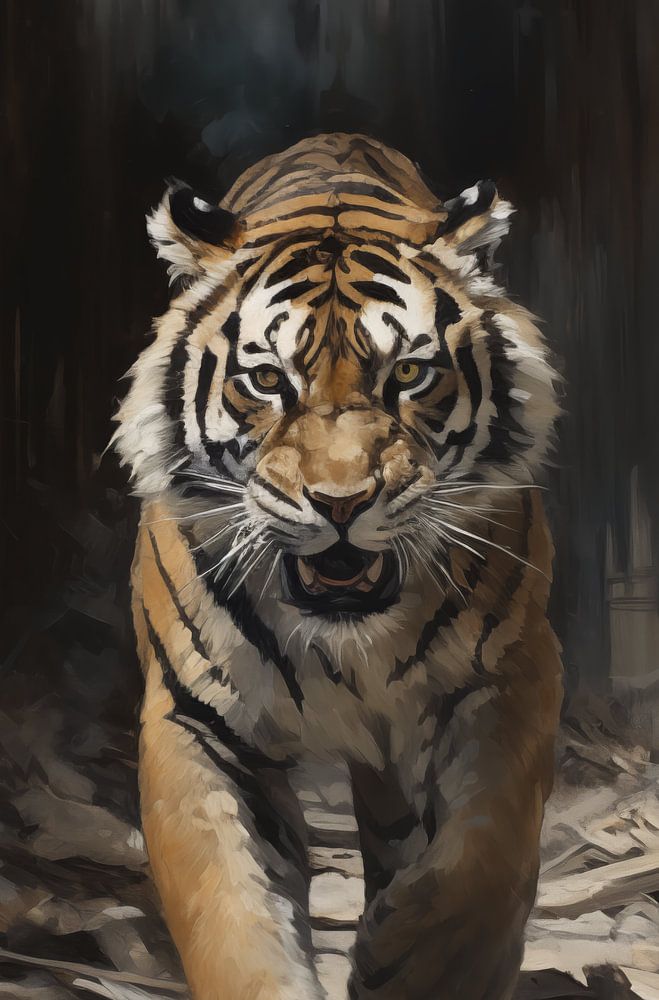 "Alleyway Apex: Tiger's Retreat" is an imposing digital painting that captures the essence of an urbane wilderness by painting the stoic steps of a tiger making its way through the ruins of an abandoned city. This piece speaks volumes about strength, survival and the sovereignty of nature, even as it traverses the fragmented traces of human habitats. The colour palette is subdued, with a focus on earthy tones that blend perfectly with the broken grey and dust of the quiet streets, while a glimpse of bright orange in the tiger's fur depicts both warning and beauty. This artwork is both a conversation starter and a profound meditation on the place of wild majesty in a man-made world, making it a perfect addition for interiors that crave pieces that carry both artistic flair and deep meaning. With its stately presence and thoughtful use of light and shadow, this work cannot help but attract attention and invite visitors to closer inspection and reflection on the interaction between the wild and the urbane.