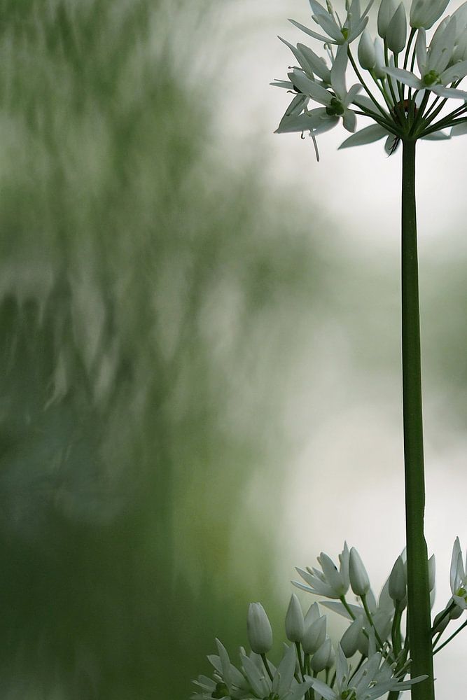 The flowers have six white flower sheets and are grouped into loose spherical shades. The plant is blooming from April to June, sometimes until July. After July, the above-ground part of the plant completely disappears and only remains the underground flower ball. The plant grows 30-40 cm high. The plant often grows in groups. The flower contains six stamens and a three-part pestle. These are surrounded by six wide oval flower sheets. The seeds are black-brown.
