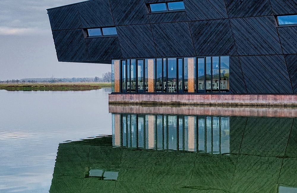Visitors Center Almere Oostvaardersplassen with the reflection in the water this visitors center / restaurant is located in the Oostvaardersplassen.