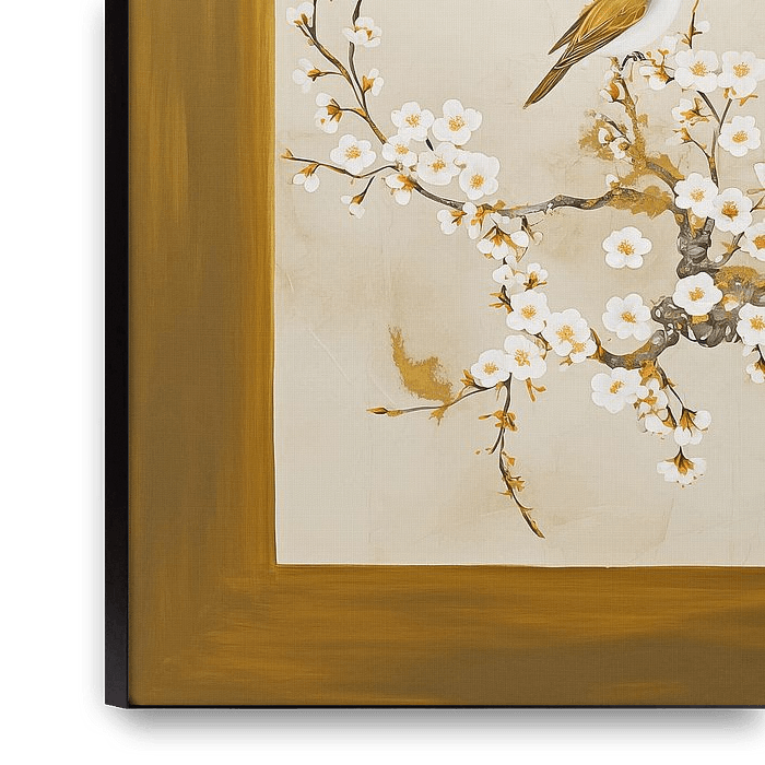 Almond Blossom with birds in the style of Vincent van Gogh, same atmosphere but slightly different. In soft earth tones. Warm and a little Japandi and Retro