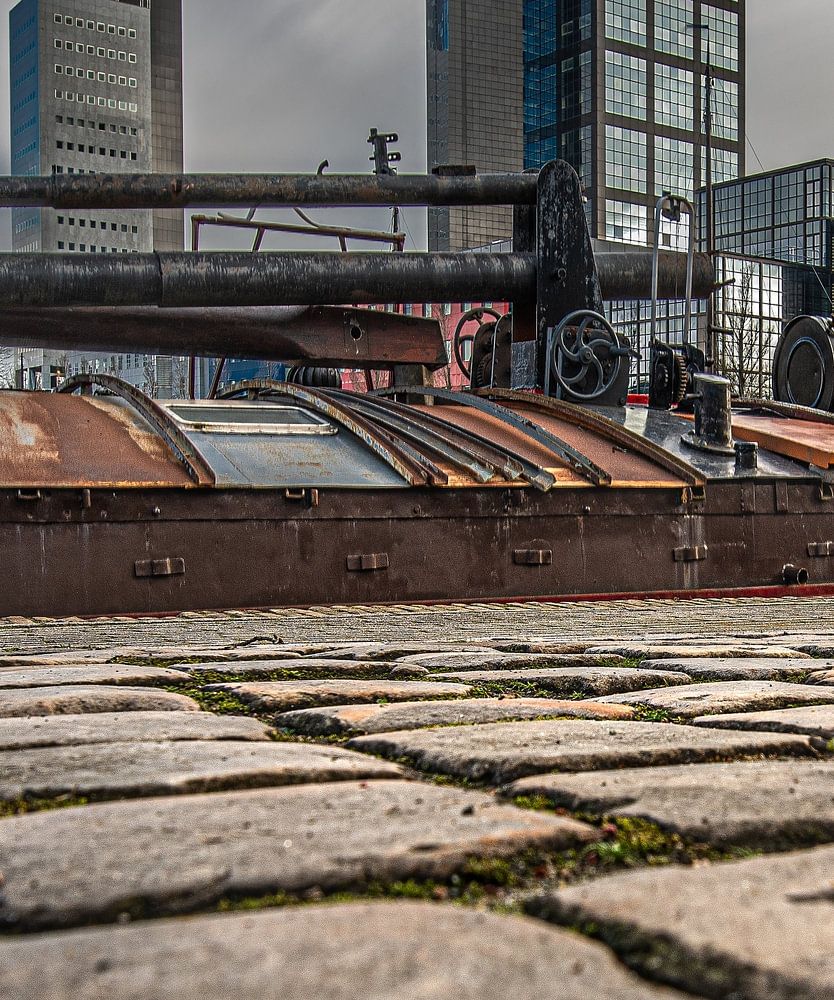 The edge of Leeuwarder Quay is the domain of cobblestones. From a frog's-eye view of the quay and its stones, the top of a ship and above it the city's 2 tallest buildings.