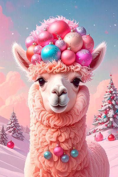 A cute alpaca, with colourful baubles on its head and baubles around its neck, stands in a snowy landscape with decorated Christmas trees and baubles. It is Christmas, winter and cold, but the alpaca has thick fur so is not bothered by this. The image was generated using ai.