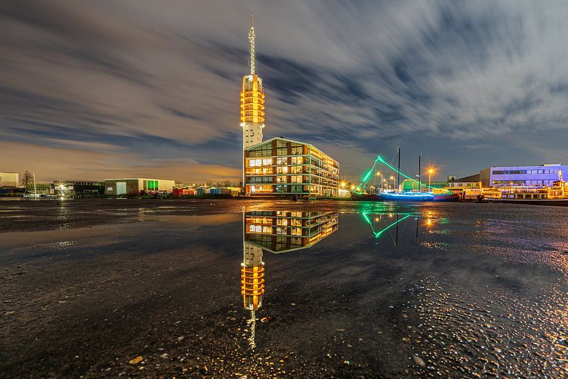 Photo of the communication tower and newly built flats located on the Rijnhaven in Alphen aan den Rijn. A photo I wanted to take for a long time but not all the conditions where always available here. This photo was taken from the ground, and there was still a puddle of water on the quay. The tower and building reflect perfectly in this puddle. And the long shutter speed makes the clouds very dynamic.