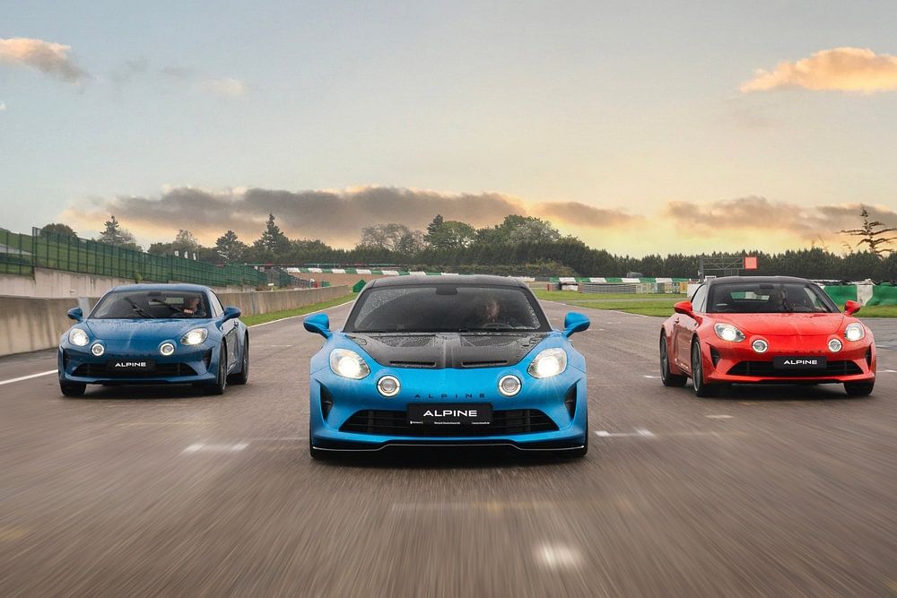 This picture shows three Alpine A110 models driving full throttle around the famous Mettet circuit in Belgium. In the middle shines the powerful, track-oriented Alpine A110R, recognisable by its striking Alpine blue colour and black carbon fibre bonnet and sporty details that stand for pure speed and precision. On either side of this A110R, we see the also two Alpine A110S models; one in a deep blue body colour and the other in vibrant red. This composition highlights the symmetry and strength of the Alpine range as they race in perfect formation across the asphalt.