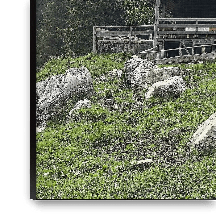 Buy this cow art Alpine hut with cows in front and mountains in the background by Robert Styppa on canvas, ArtFrame, poster and wallpaper, printed on demand in high quality.