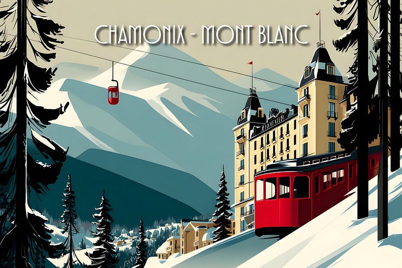 A stylised, illustrative winter view of Chamonix in front of Mont Blanc. In the foreground, a bright red mountain railway ascends a snow-covered slope, flanked by dark fir trees. Behind it rises an elegant grand hotel in the Belle Époque style, while the snow-covered mountain massifs of the Mont Blanc massif rise majestically in the…