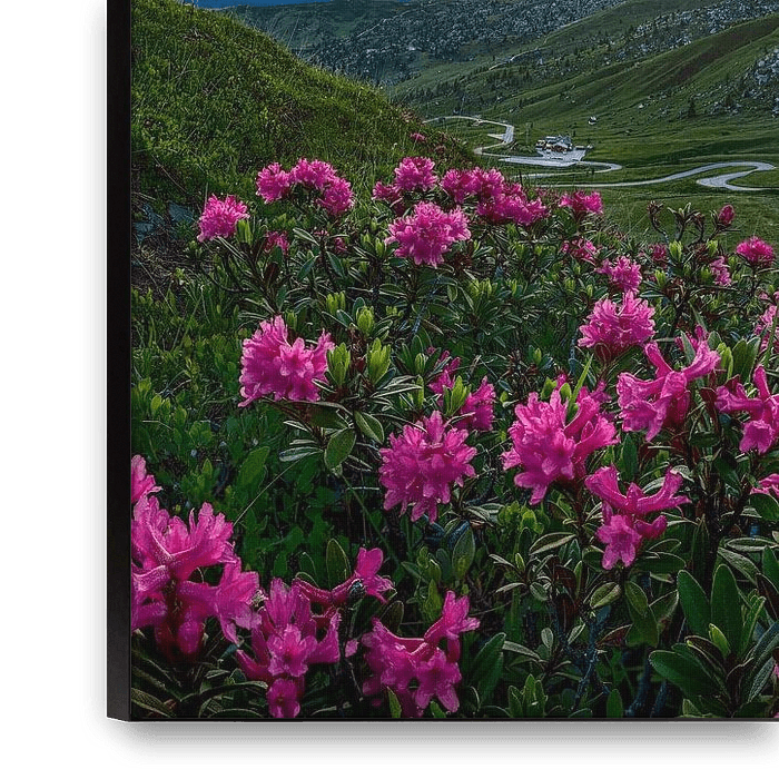 Buy this landscape artwork Alpine roses at sunset in South Tyrol by Voss photography on canvas, ArtFrame, poster and wallpaper, printed on demand in high quality.