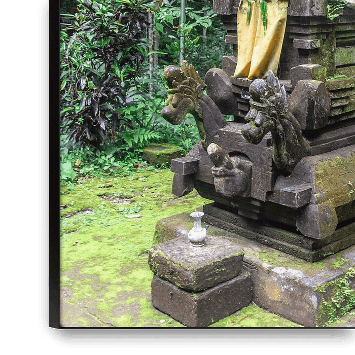 Altar with robe among the trees near Ubud on the island of Bali in Indonesia. During a rainy day.