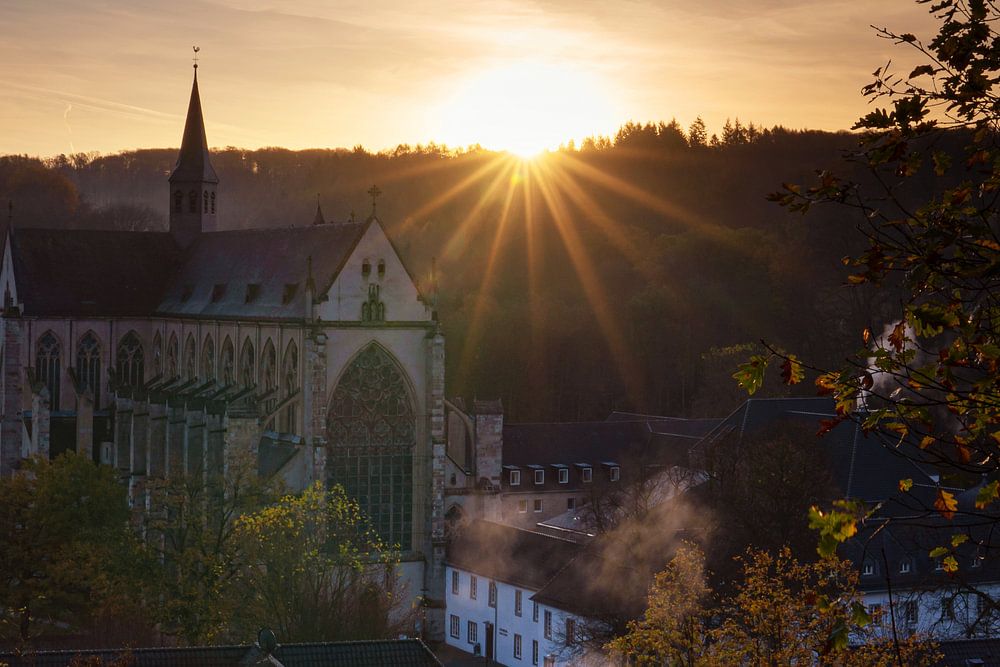 Panorama of Altenberg Cathedral at sunrise, Bergisches Land in North Rhine-Westphalia, Germany