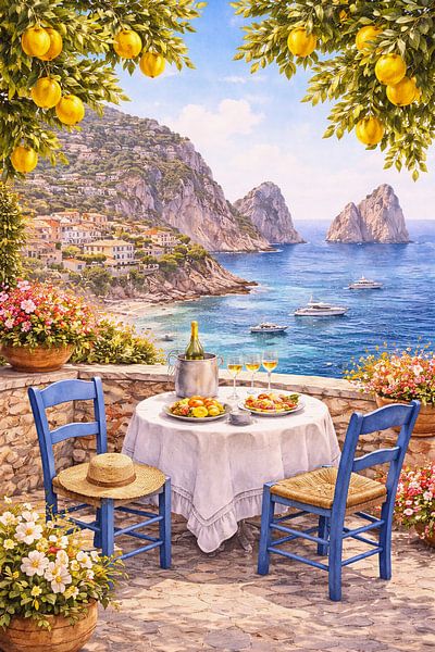 A bright Mediterranean terrace overlooking the breathtaking Amalfi Coast. Lemon trees frame a charming seaside dining table set with wine and fresh summer dishes while turquoise waters sparkle under the Italian sun. Colorful coastal homes climb the cliffs, creating a dreamy Italian Riviera atmosphere. This artwork captures the romantic…