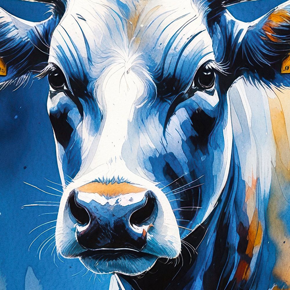 The vibrant depiction of a cow is characterised by bright blue tones and contrasting warm tones, creating a captivating visual effect. The animal's expressive eyes and textured coat add personality and depth.