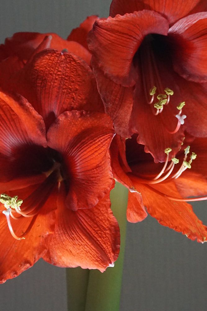 Schitterende rode amaryllissen die uit een bloembol groeide. De achtergrond is wit behang zodat de rode kleuren mooi tot zijn recht komt.