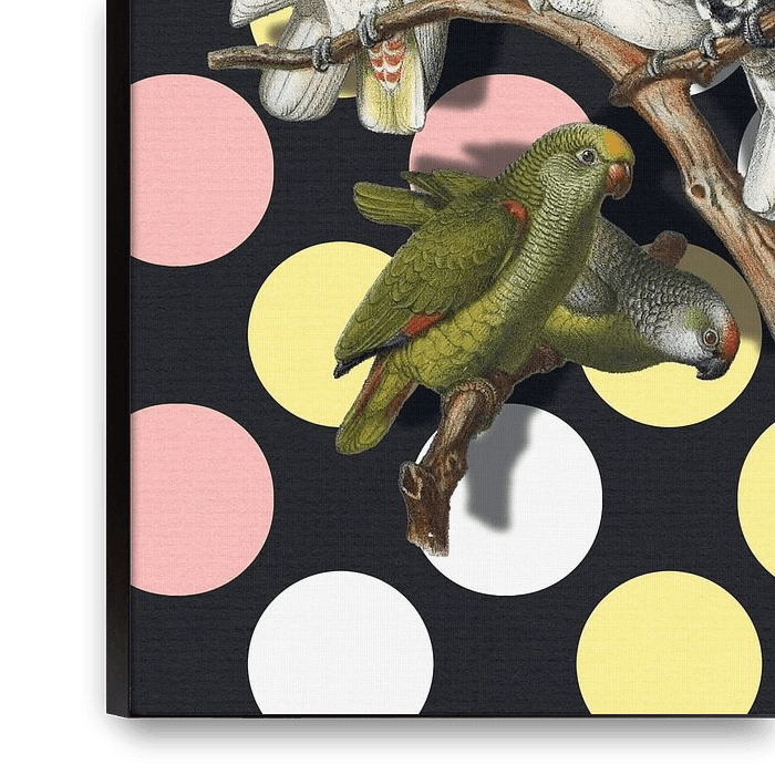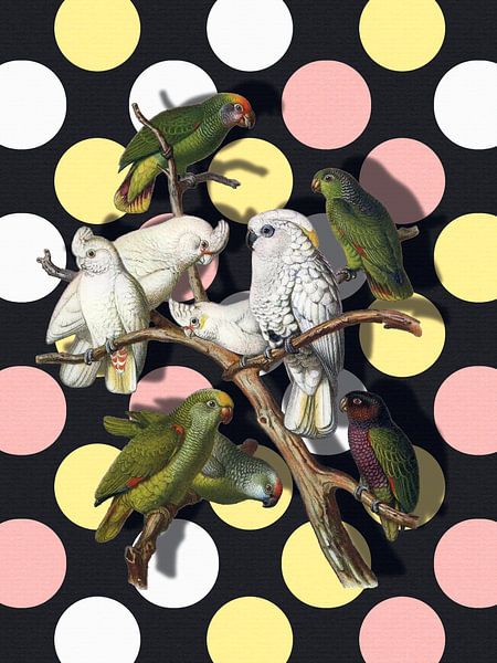 A collage of authentic, vintage and detailed illustrations of Amazon parrots and cockatoos on a graphic, dotted retro background.