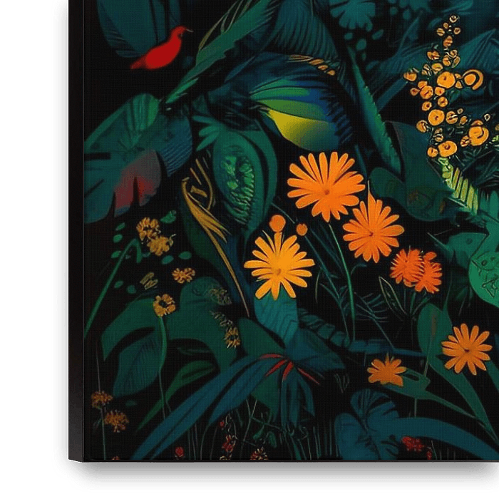 The colour palette includes red, black, yellow, green and orange hues. The scenery is characterised by lush foliage that features rich textures and ornate details, highlighting the beauty of nature. This artwork…