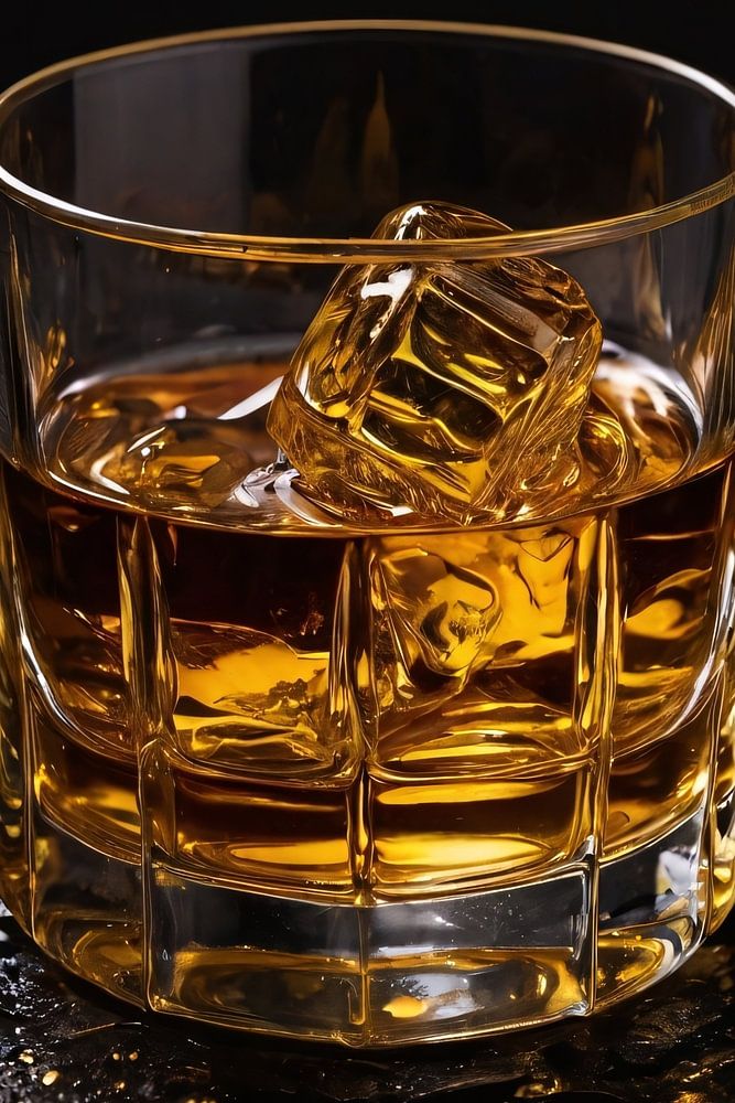 This beautiful design depicts a classic whisky glass filled with a noble amber drink, crowned with crystal clear ice, providing a refreshing touch. The golden rim of the glass catches the light and creates an elegant sparkle, while the moisture outside the glass evokes a suggestion of relaxation and conviviality. The black stone on which the glass rests, enriched with subtle gold speckles, enhances the warm look of the whisky and invites a moment of rest and enjoyment. This design is not just a visual delight, it almost seems like an invitation to experience the complexity and rich aromas of a good whisky for yourself. Perfect for a rustic kitchen or a sophisticated living room, this image speaks to connoisseurs of life who value the finer things.