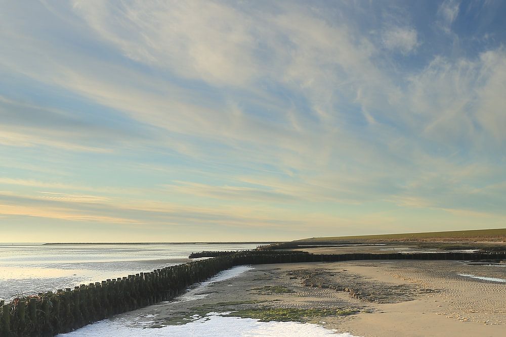 Ameland Hollum Sunset at the feugelpolle at low tide during winter weekend .