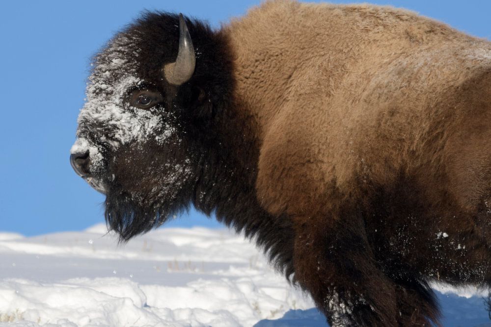 American Bison ( Bison bison ) in winter, standing in deep snow on a hill against blue sky, snow covered face, Yellowstone NP, Wyoming, USA.