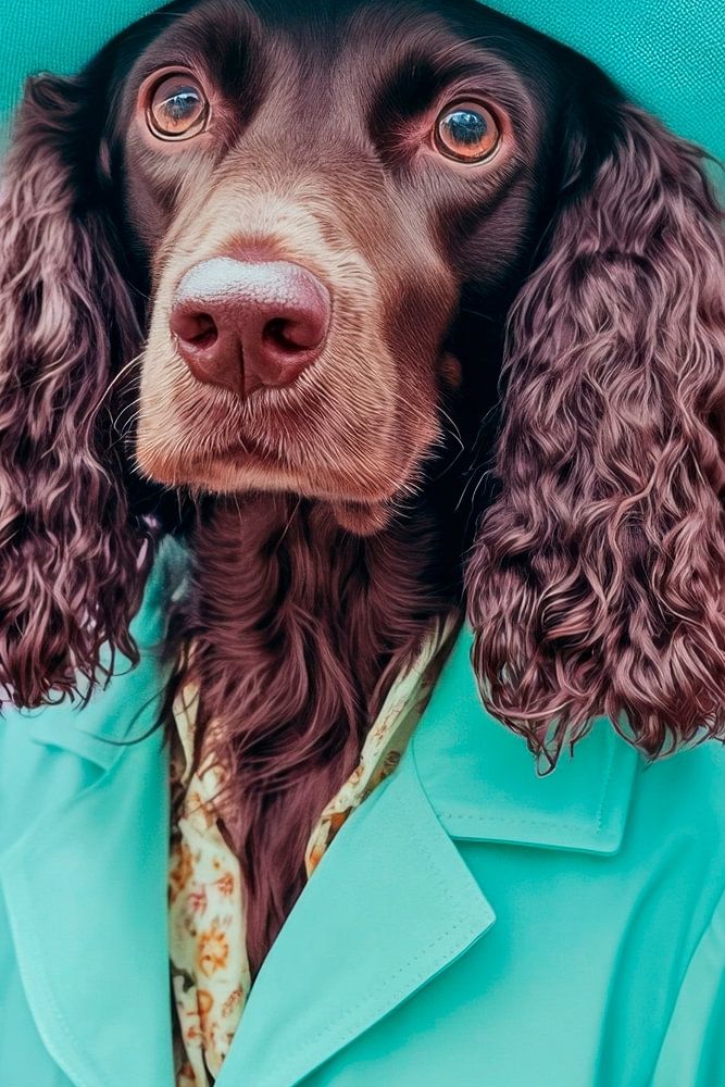 In a dazzling outfit of mint green, this American Water Spaniel embodies style and charm. With his curly, shiny coat and expressive eyes, he attracts everyone's attention. The elegant hat is the icing on the cake, while his self-confident demeanour is reminiscent of a charming personality ready to conquer the world.