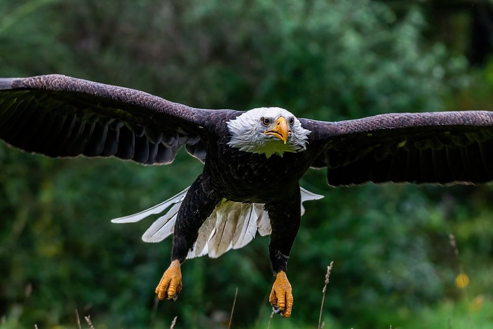 The imposing American Bald Eagle -Haliaeetus leucocephalus- is landing here.