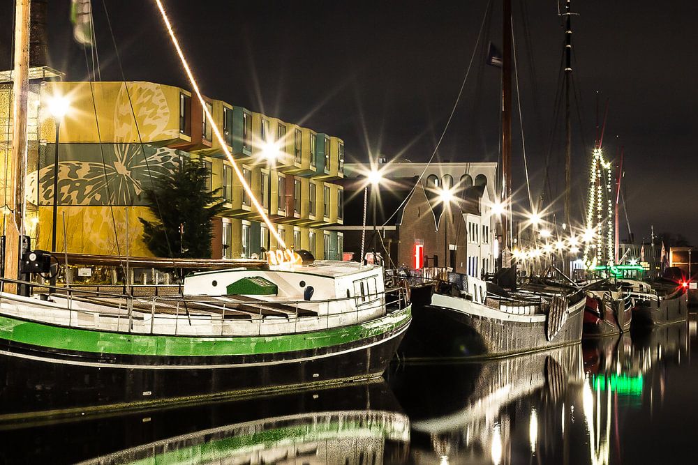 De oude fraai verlichte Eemhaven van Amersfoort, met o.a. de Inspiratieboot. Dit schip is te huur voor feesten en partijen, zowel varend als in de haven. Het centrum en het havengebied van Amersfoort zijn s'avonds prachtig verlicht!