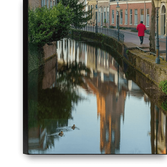 A serene morning glow hugs the historic canals of an Amersfoort. The majestic, late-gothic Onze Lieve Vrouwetoren, affectionately called the 'Lange Jan', rises from the low buildings and its refined architecture is illuminated by the early sunlight. The narrow canal acts as a perfect mirror, in which the ancient facades and…
