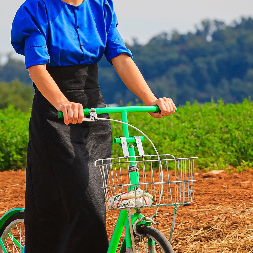 A 1:1 square photo of a smiling Amish girl wearing a Bonnet (head cap) and barefoot on her traditional Amish scooter near Lancaster, Pennsylvania, USA.