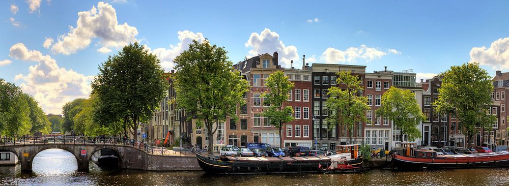 Prachtige panoramische opname van de rivier de Amstel in Amsterdam op een mooie zomerdag met wolken met aan de rechterkant een deel van de Magere brug