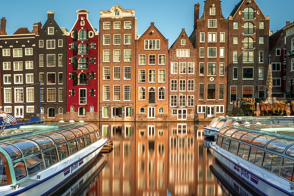 A view of the Damrak in Amsterdam. The canal boat, the canal houses, the canal, a typical image of the capital of the Netherlands. The photo was taken on a sunny afternoon. The sunlight during the golden hour provides a warm image.