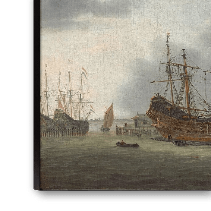The billowing clouds, fluttering flags, and slightly choppy waters give life to this engaging view of Amsterdam’s harbor. A warship and several merchant ships are tied up inside the breakwater for maintenance and repairs. A man on a temporary platform works on the hull of the three-master to the left of center, while his colleague tends to a vat of hot tar on a floating dock. Two women have tied their skiff to the dock to do laundry in the harbor’s waters.