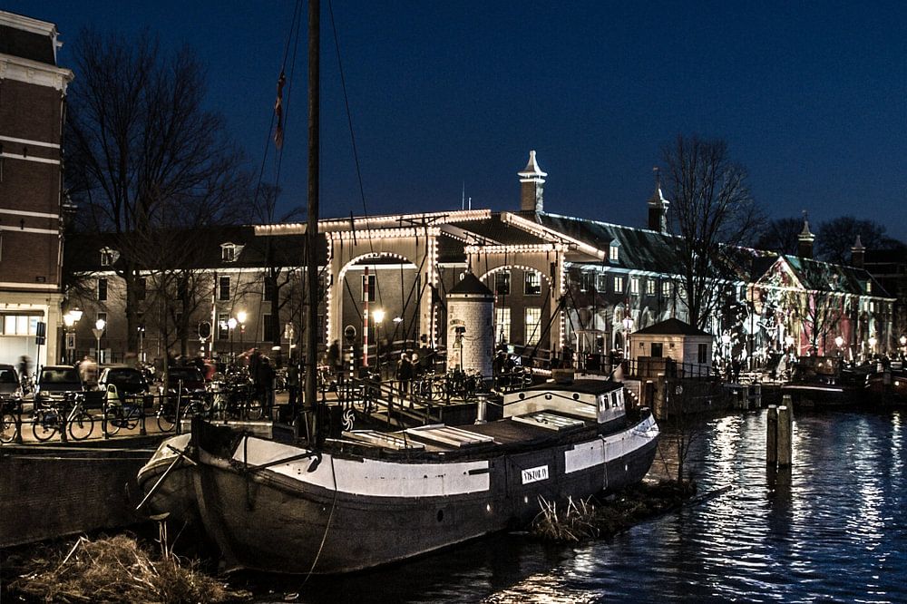 Amsterdam bij nacht met theater Carre op de achtergrond