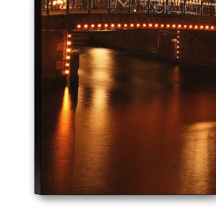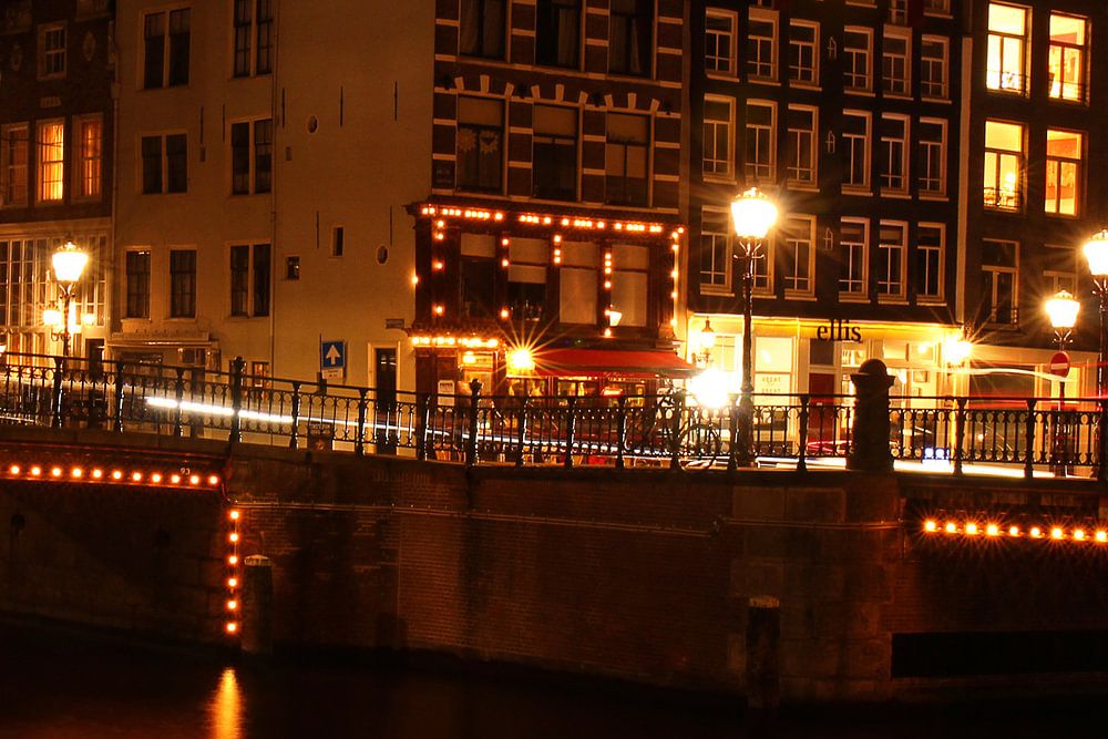 Typical Amsterdam at night. Illuminated canals and buildings and bikes parked everywhere.