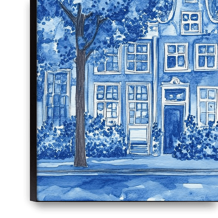 This painting, done in classic Delft blue tones, depicts an iconic image of Amsterdam canal houses along a quiet canal. The canal houses, with their characteristic gables, narrow windows and graceful rooflines, are carefully rendered in different shades of blue and white, giving the painting a serene and almost dreamlike atmosphere. The…