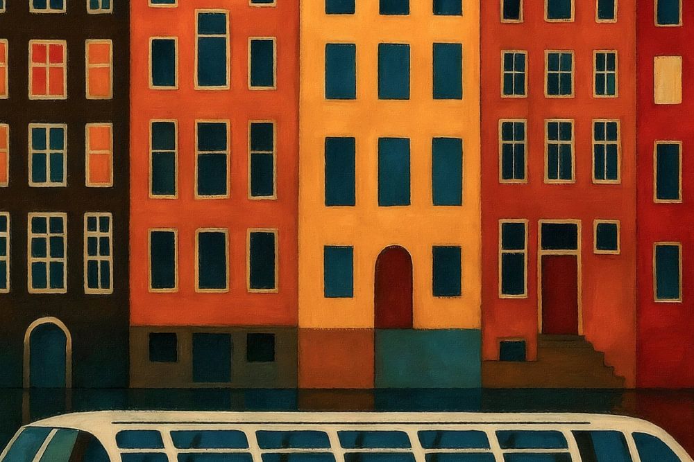 This colourful cityscape of Amsterdam depicts a picturesque scene on a quiet canal, characterised by warm, bright façades and a white boat in the foreground. The tall, narrow houses with their characteristic gables are reflected in the water, creating a harmonious balance of architecture, colour and atmosphere. The bold reds, oranges…