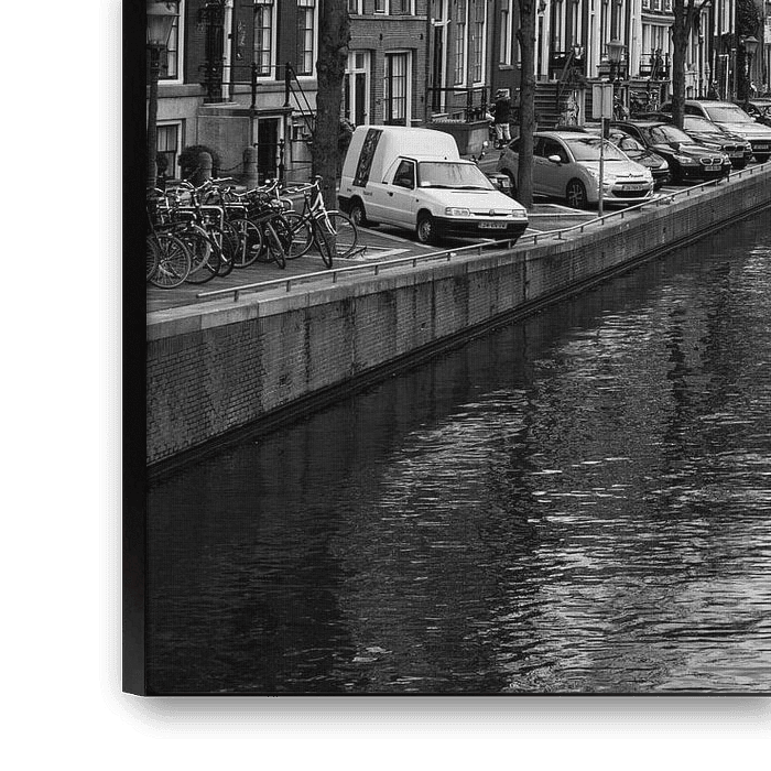 The photograph shows a classic Amsterdam canal in black and white, with the canal itself at the centre of the image. The mirror-smooth surface of the water provides a resting point and draws the eye to the centre of the composition. On either side of the canal rise the narrow, tall houses, characteristic of Amsterdam's historic architecture. Their facades are built close together, enhancing the typical urban atmosphere of the ring of canals. The choice of black and white emphasises the shapes and lines, making the image feel timeless and serene. The lack of colour brings out the contrast between light and shadow more strongly, accentuating the textures of the water, facades and street furniture. This monochrome approach gives the photo a nostalgic, almost cinematic feel, as if it captures a moment from the past. The symmetry of the canal and the houses along the water emphasises the understated beauty and craftsmanship of the city's architecture. This image evokes a sense of silence and contemplation, a moment of calm in the hustle and bustle of the city.