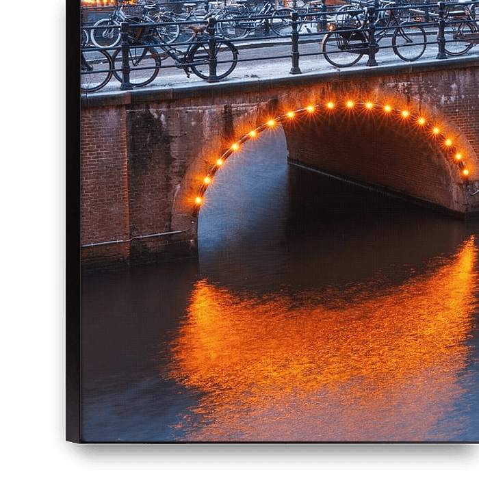 A panoramic photo of the intersection between Keizersgracht and Brouwersgracht. The balance in this photo is created by the ship on the right and the lights and bridge on the left. The tree in the foreground gives good depth.